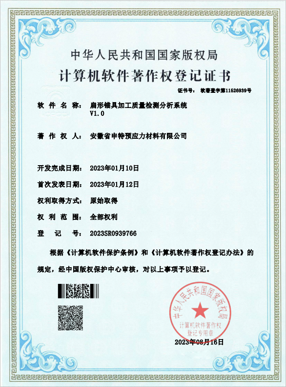近日,由安徽申特預應力材料自主研發的《圓錨加工工藝信息化云平臺系統V1.0》、《夾片智能質量檢...